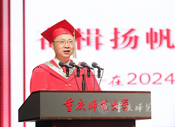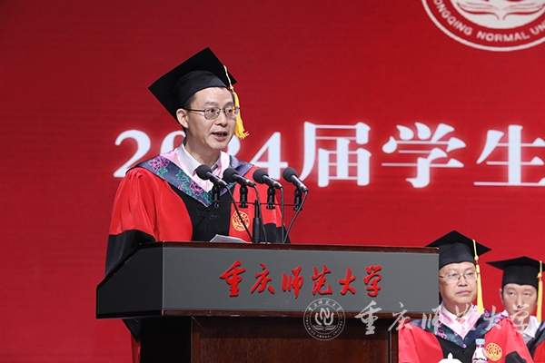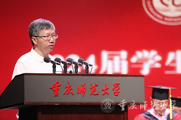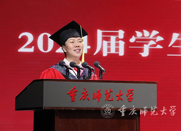 教师代表、物理与电子工程学院二级教授、博士生导师,重庆英才计划创新领军人才、重庆市杰出青年基金获得者、重庆市“巴渝学者”特聘教授余鹏老师用“自由能、熵增、能量守恒定律”3个物理学专有名词为即将踏上新征程的毕业生送上了最诚挚的祝贺。他寄语毕业生要始终保持对生活的热爱、对知识的渴望和对真理的追求;要拥有改变现状的内生动力,相信自己学到的知识和培养的能力,以积极的心态面对生活中的挑战和变化;要始终铭记自己的责任与担当,学会感恩和回馈社会,用爱心温暖世界。