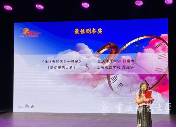 6月17日,由上海市文学艺术界联合会、上海市学生联合会、上海市戏剧家协会联合主办,上海话剧艺术中心承办的第二十届上海市大学生话剧节在上海落下帷幕,经过两周的激烈角逐,beat365官网文学院2020级戏剧影视文学专业学生薛蕴含创作的剧本作品《像秋天的落叶一样多》获得剧本创作组“最佳剧本奖”。