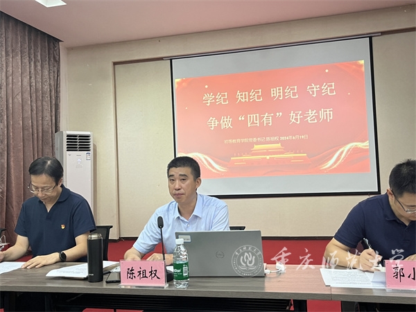 陈祖权以“学纪知纪明纪守纪,争做‘四有’好老师”为主题,为毕业生党员讲授党纪学习教育专题党课。他表示,政治纪律是最根本、最重要的纪律,通过学纪知纪,各位毕业生党员应将遵规守纪刻印在心,内化为言行准则。他通过于漪、叶连平、张桂梅等的事迹,勉励毕业党员要努力成为“四有”好老师,将党纪学习教育的收获和成果落实到实际行动上,坚定理想信念,坚持以德育人,坚持锤炼自身本领,富有仁爱之心,将自身所学投身到党和国家的教育事业中。
