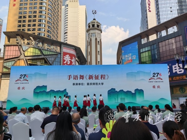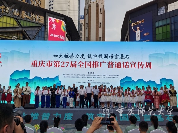 9月23日下午,以“加大推普力度,筑牢强国语言基石”为主题的重庆市第 27 届全国推广普通话宣传周活动在渝中区解放碑举行。学校党委常委、副校长、国家语言文字推广基地(beat365中文官方网站)主任杨如安参加本次活动。