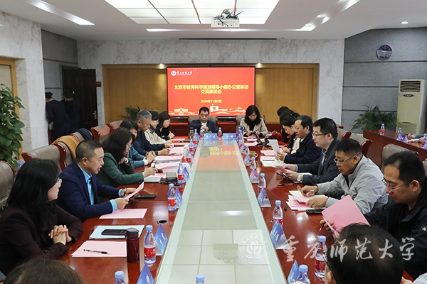 11月6日,北京教育科学研究院党委委员、副院长,北京教育科学规划领导小组成员张熙一行到beat365官网调研交流,双方召开座谈交流会。重庆市教育科学规划领导小组办公室副主任、重庆市教育科学研究院科研处处长沈兵,学校党委常委、副校长孟小军,副校长贾韬出席座谈会。