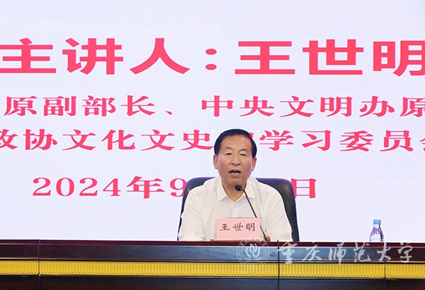 9月26日上午,“智荟重师”干部大讲坛第四期专题讲座在博雅楼504会议室举行。中共中央宣传部原副部长、中央文明办原专职副主任、第十三届全国政协文化文史和学习委员会副主任王世明应邀作《关于文化自信的学习思考》专题讲座。在家校领导、处级领导干部和科级干部共计270余名同志参会,专题讲座由学校党委书记张艳主持。