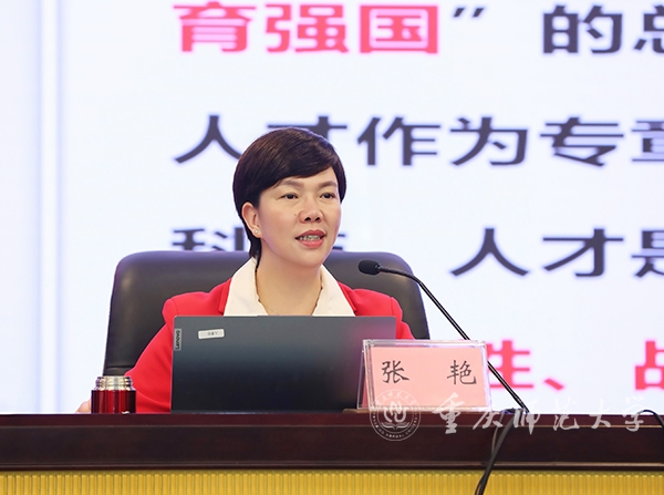 张艳指出,校史文化是学校文化的重要组成部分,是学校精神内核的集中体现。今年是学校建校70周年,但学校的办学历史可以追溯到1906年成立的官立川东师范学堂。她讲述了学校的发展历程、取得的显著成绩以及学校第四次党代会提出的未来5-30年建成“教师教育特色鲜明、具有国际影响的全国一流综合性师范大学”的发展目标和“13649”的发展思路。新进教职工要传承“自强不息,躬行师道”的重师精神,坚定学校发展信心,不断增强爱校荣校的归属感、光荣感和自豪感。
