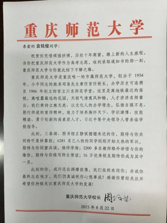 22日-27日,各学院陆续将校长署名书信寄达或送达到2015级未报到新生手中,受到考生、家长及社会的充分肯定和赞许。其中,教育科学学院辅导员李博和高洁老师分别走访重庆市巴南区和江津区的2名新生,并与学生、家长亲切交流,认真解答学生问题,介绍学校本科人才培养方案和专业发展前景,消除学生疑虑。经过李博老师细致的现场交流和后续的电话沟通,目前该院2015级特殊教育专业袁铭俊同学已到校报到就读。计算机与信息科学学院和初等教育学院在为每一位未报到新生邮寄信件后,经过学院领导和辅导员持续不断的电话沟通,2015级软件工程(服务外包)专业徐文坤同学和小学教育专业饶佳敏同学均已到校报到就读。数学科学学院2015级信息与计算科学专业(软件服务外包)专业张佳旭同学应征入伍一直没有联系,学校的邮寄信件经其姐姐收到后确认于9月初到校报到。地理与旅游学院党委副书记陈祖权带队前往重庆市綦江县走访罗鑫雨、王静、庞姣艳3位同学。在綦江县东溪镇一间租赁房中见到王静同学的家长时,王静已经开始了在綦江中学的复读生活。经过与其家长长达半天的交流,家长于下午带领陈书记一行来到綦江中学。虽然最终王静同学仍然选择复读,但我们祝福她心想事成。随着这119封公开信传递的不仅是学校领导、老师、同学的关心与祝福,更是学校在内涵发展、提档升级背景下提高新生报到率的创新举措。这一举措既体现了学校立教无类、以文化人的办学理念,又彰显了学校以生为本、开放负责的担当精神。