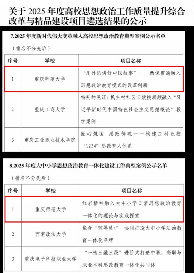近日,教育部公示了2025年度高校思想政治工作质量提升综合改革与精品建设项目遴选结果。经公示无异议,学校“‘用外语讲好中国故事’——两课贯通融入思想政治教育模式的改革创新”及“红岩精神融入大中小学思想政治教育一体化的理论与实践探索”两个项目,分别入选新时代伟大变革融入高校思想政治教育典型案例和大中小学思想政治教育一体化建设工作典型案例。
