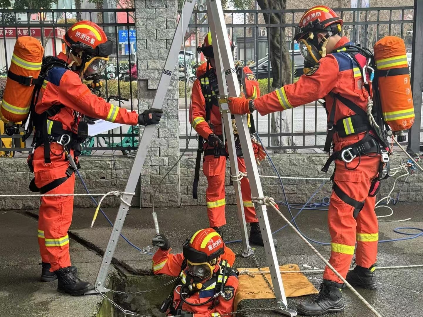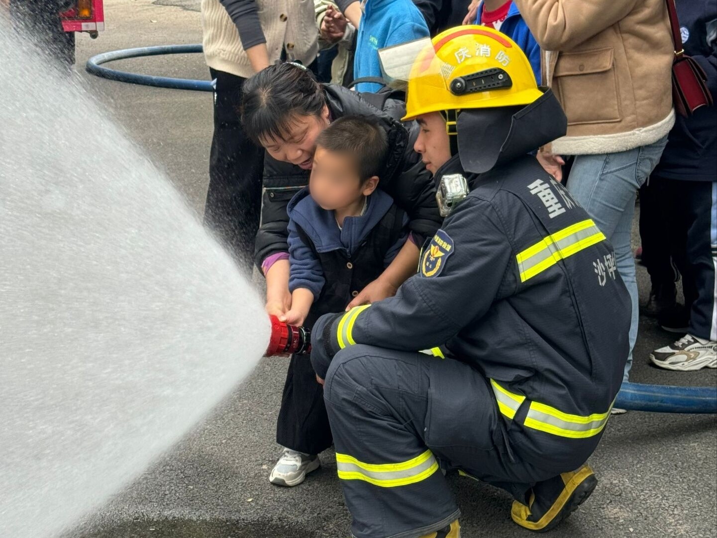 在消防技能展示环节中,消防员们快速叠出“豆腐块”被褥,进行井下救援演练和模拟火灾实战,利用烟雾机制造火场环境,演示快速破拆、伤员转移等流程。孩子们在指导下手持消防水枪扑灭“火源”,在实际操作中强化了灭火技能。