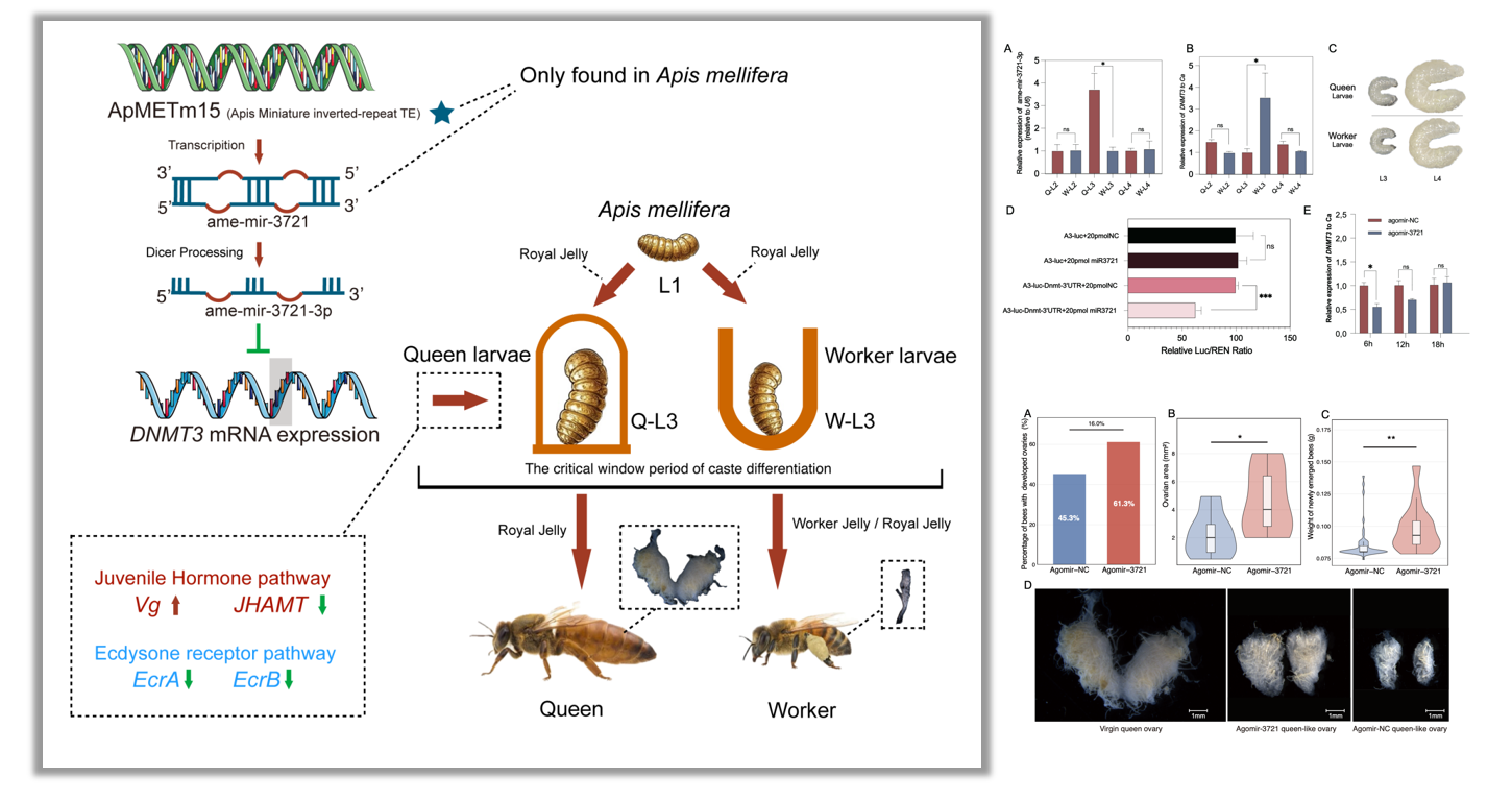 在该项研究中,团队成员通过全基因组分析,鉴定出一种西方蜜蜂(Apis mellifera)基因组中特有的转座子ApMETm15及其衍生的miRNA(ame-mir-3721-3p)。通过时空表达分析、靶基因预测和荧光素酶报告基因实验等多种方法,研究人员确认ame-mir-3721-3p能特异性结合并抑制DNA甲基化酶基因DNMT3的表达,该基因编码一种关键的表观遗传调控酶,负责催化DNA胞嘧啶第5位碳原子的甲基化修饰,进而影响染色质结构和基因表达,并调控下游保幼激素和蜕皮激素信号通路相关基因表达。研究发现,ame-mir-3721-3p的过表达显著抑制DNMT3表达,并显著上调卵黄蛋白前体基因(Vg)的表达,同时抑制保幼激素酸甲基转移酶基因(JHAMT)和两个蜕皮激素受体基因(EcrA/B)的表达,构建了一个完整的表观遗传调控网络,进而驱动蜜蜂的种姓分化。研究人员进一步合成了miRNA模拟物,通过表型观测与分子鉴定,验证了其蜜蜂幼虫L3期即种姓分化关键窗口期发挥作用,调节了出房蜂的卵巢发育。