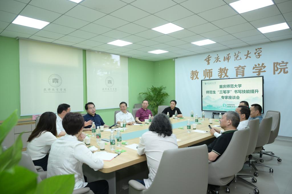 5月8日上午,为适应新时代教师人才培养需求,进一步提升师范生“三笔字”(毛笔字、钢笔字、粉笔字)书写技能,夯实教学基本功,beat365官网在集贤楼202-1会议室召开师范生“三笔字”书写技能提升专家座谈会。重庆市书法家协会主席漆钢,副主席吴云斌、周庶民、胡正好,中国书协会员苏大椿,重庆市硬笔书法家协会顾问钟健出席会议,beat365官网党委常委、副校长孟小军主持会议,教师教育学院相关负责人、书写技能课程教师代表参会。