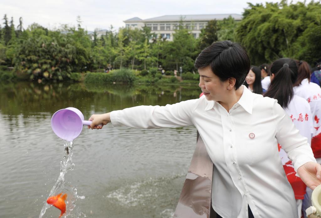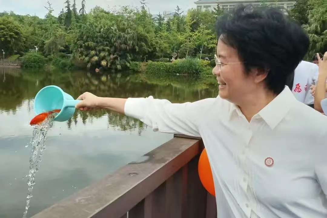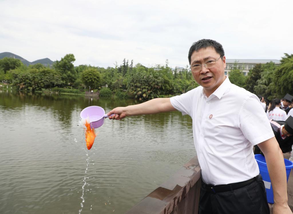 活动现场,毕业生们怀着感恩之情汇聚湖畔。随着张艳宣布活动正式开始,寄托师生情谊与美好愿景的锦鲤鱼苗跃入湖中,三春湖顿时波光粼粼。这片承载无数校园记忆的湖水,此刻化作情感的纽带与梦想的港湾,凝聚着师生对往昔的眷恋与对未来的憧憬。