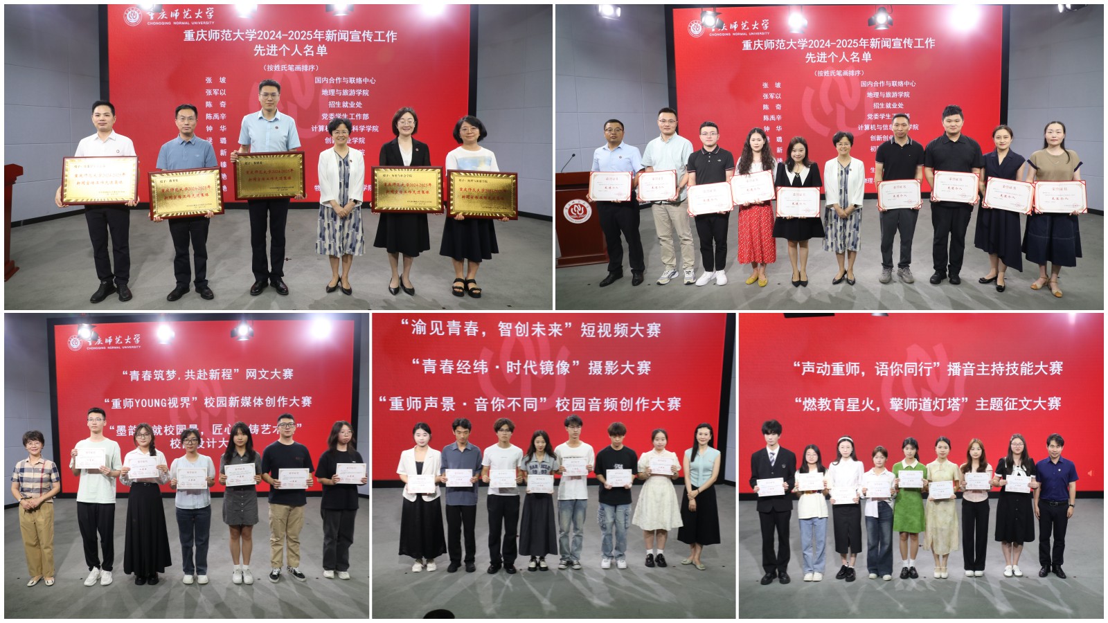 校党委常委、宣传部部长党亚莲宣读《关于表彰beat365中文官方网站2024 - 2025年新闻宣传工作先进集体和先进个人的决定》《关于公布beat365中文官方网站“融媒聚力 智起未来”第二十五届新闻宣传活动月获奖名单的通知》。周学馨为2024 - 2025年新闻宣传工作先进集体和先进个人颁奖。相关职能部门负责人为第二十五届新闻宣传活动月获奖学生代表颁奖。与会师生共同观看了《第二十五届新闻宣传活动月集锦》视频。获奖师生代表在分享感言时纷纷表示,将继续致力于捕捉校园瞬间,展现学校青春风采与人文关怀,挖掘新闻里打动人心的细节与温度,为讲好重师故事和中国故事贡献力量。