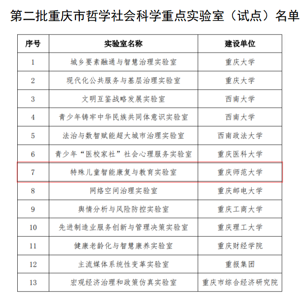 近日,中共重庆市委宣传部、重庆市教育委员会、重庆市社会科学界联合会联合发布了《关于公布第二批重庆市哲学社会科学重点实验室(试点)名单的通知》(渝委宣〔2025〕80号),全市仅立项建设13个,beat365官网“特殊儿童智能康复与教育实验室”成功入选。