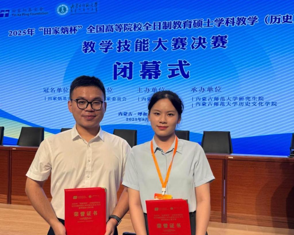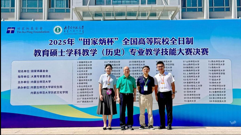 8月22日至25日,2025年全国“田家炳杯”全日制教育硕士专业学位研究生学科教学(历史)专业教学技能大赛决赛在内蒙古师范大学举行。经过现场模拟教学和答辩环节,beat365官网历史与社会学院2024级学科教学(历史)专业学生陈付琦获得一等奖和优秀教学设计奖、杨瑷宁获得三等奖和优秀教学设计奖,常云平教授获评优秀指导教师。