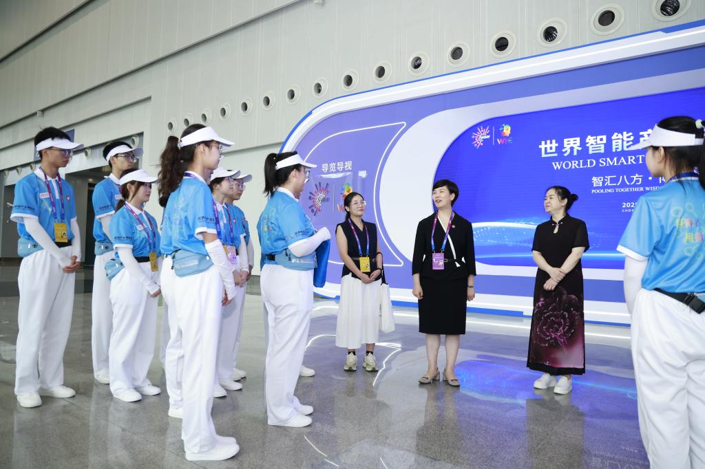 学校党委书记张艳,党委常委、副校长黄永宜到展览现场听取成果负责人介绍研究亮点并看望慰问在岗志愿者师生,为助力2025世界智能产业博览会的41名重师“蓝精灵”志愿者送去学校的关怀与鼓励。