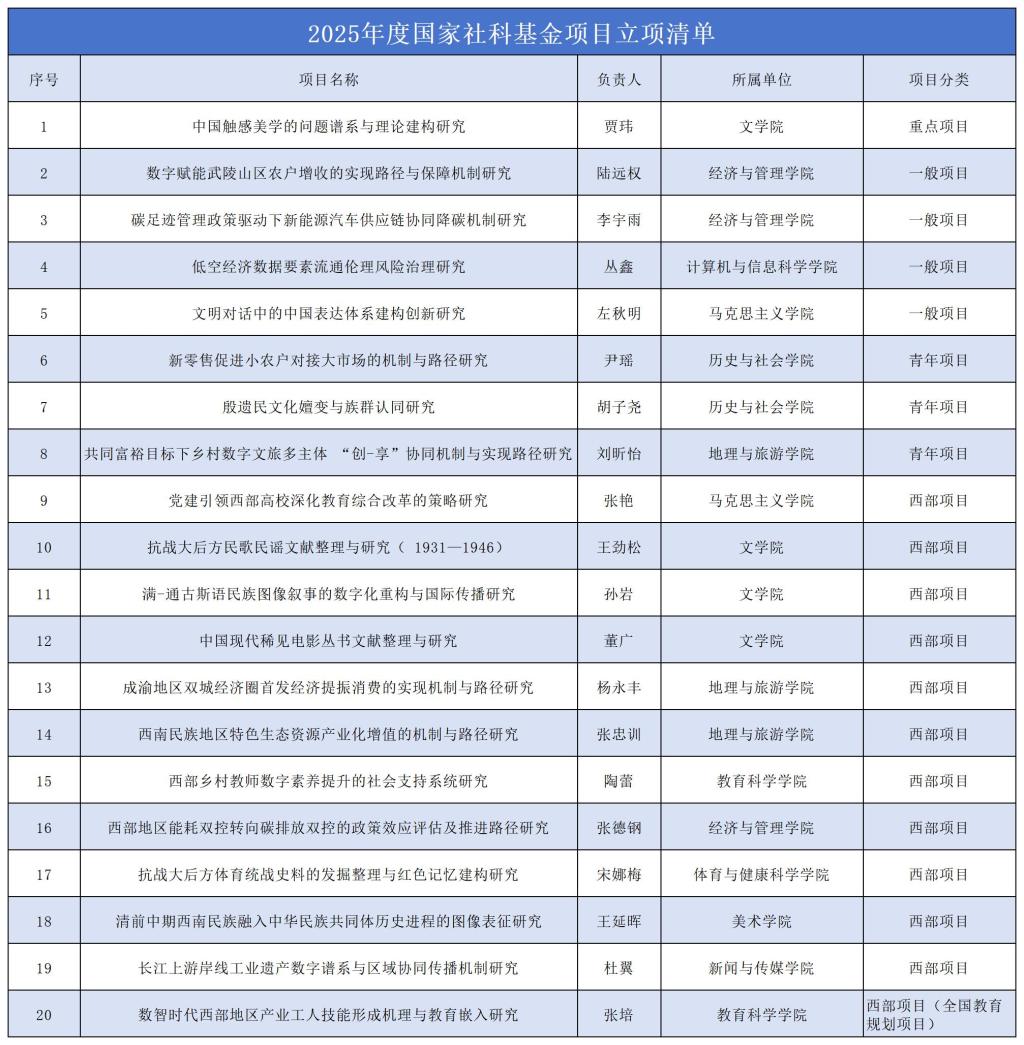 近日,全国哲学社会科学工作办公室正式公布了2025年国家社科基金年度项目的立项名单beat365官网19个项目获批立项包含重点项目1项、一般项目4项、青年项目3项、西部项目11项。另外,8月份公布的全国教育科学规划立项项目中beat365官网斩获西部项目1项,截止前共计20项国家社科基金项目获准立项。其中,贾玮教授主持的《中国触感美学的问题谱系与理论建构研究》获批重点项目,体现了beat365官网在中国文学学科的深厚底蕴,这也是beat365官网连续第6年获得国家社科基金重点项目。
