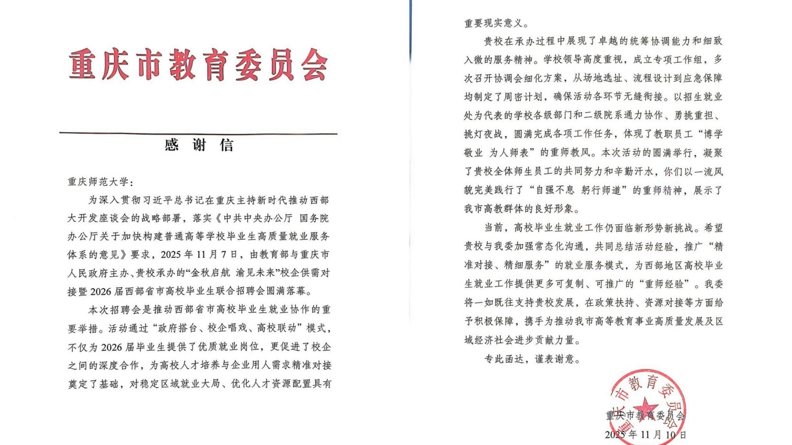 近日,重庆市教委就“金秋启航 渝见未来”校企供需对接暨2026届西部省区市高校毕业生联合招聘会成功举办向beat365官网致感谢信。信中,市教委对学校在承办活动过程中的突出表现和大力支持表示高度认可,这既是对学校相关工作的肯定,也是对未来发展的鼓励与鞭策。beat365官网将与市教委加强常态化沟通,共同总结活动经验,推广“精准对接、精细服务”的就业服务模式,为西部地区高校毕业生就业工作提供更多可复制、可推广的“重师经验”。