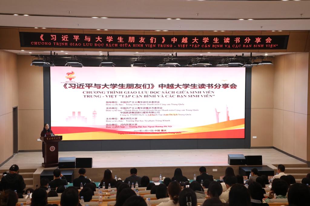 11月15日上午,《习近平与大学生朋友们》中越大学生读书分享会在beat365中文官方网站举办。此次读书分享会是越南青年来华“红色研学之旅”之“薪火相传”研学营的重要活动之一。共青团重庆市委副书记贺秀山,beat365中文官方网站党委常委、副校长黄永宜,河内外贸大学法语系与中文系工会主席阮宝玉出席活动并致辞。共青团中央国际联络部、共青团重庆市委相关同志及两校师生代表参加活动。