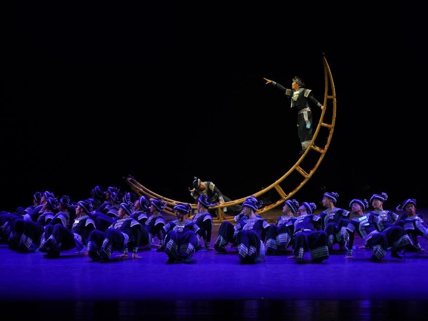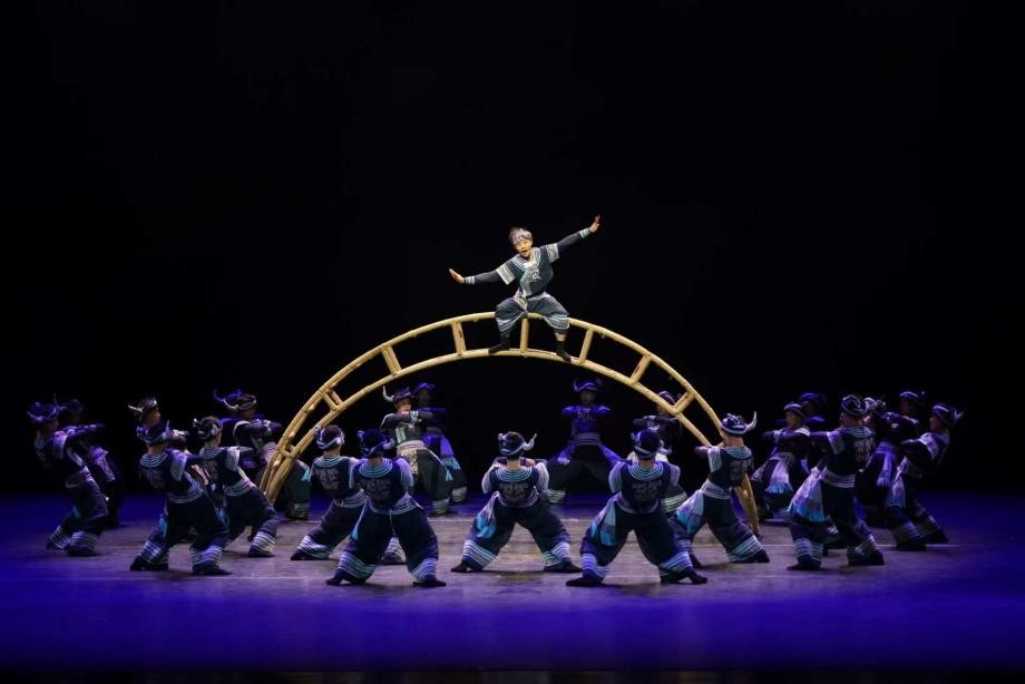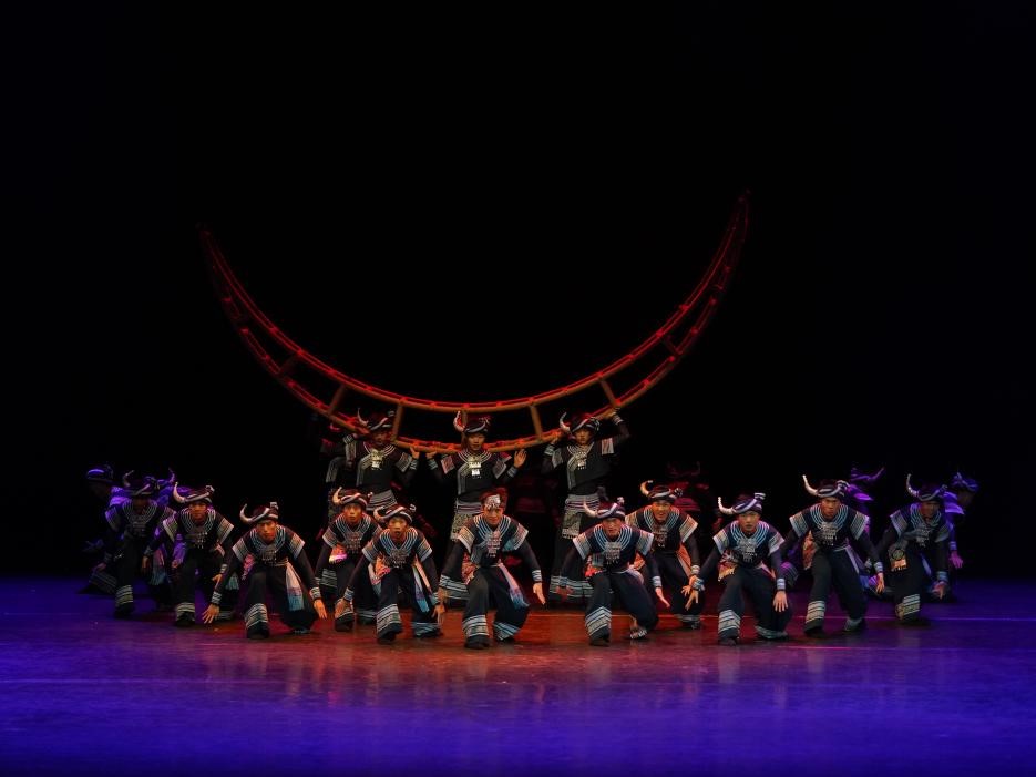 在艺术呈现上,作品巧用道具营造强烈视觉张力,将道具幻化为山洞、桥梁、摇篮、月亮、牛角等丰富意象,构筑出满含象征意义的诗意空间。核心立意“过山”是武陵山脉的具象呈现,也是民族历史中需跨越的艰难险阻,更是每个人内心亟待征服的精神高地,最终完成从身体跋涉到精神攀登的壮丽升华,谱写了中华儿女在时代征程中永不停歇的奋进史诗。