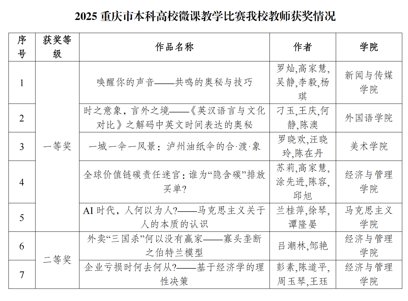近日,2025年重庆市本科高校微课教学比赛结果揭晓,beat365官网教师凭借扎实的教学功底、创新的教学设计与精湛的教学能力脱颖而出,共斩获一等奖5项、二等奖2项,在全市高校中彰显了beat365官网师资队伍建设的过硬实力与教学改革的丰硕成果。