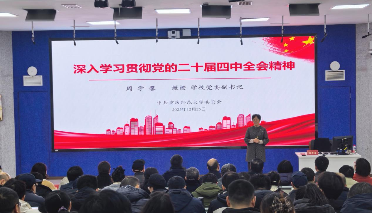 会上,周学馨围绕学习贯彻党的二十届四中全会精神,从准确把握“十五五”时期在基本实现社会主义现代化进程中的重要地位,深刻领会“十五五”时期经济社会发展的指导思想和主要目标,全面理解“十五五”时期经济社会发展的战略任务和重大举措,以及坚持和加强党的全面领导、凝聚起推进中国式现代化的磅礴力量四个方面对全会精神进行了系统阐释和全面宣讲。报告充分体现二十届四中全会报告的“重庆元素”和“教育特色”,重点阐释了“十五五”时期重庆经济社会发展的重大机遇、重大任务以及“十五五”时期高等教育面临的主要形势和应对思考,脉络清晰、内容翔实、阐释深刻,具有很强的思想性、理论性、指导性和针对性。