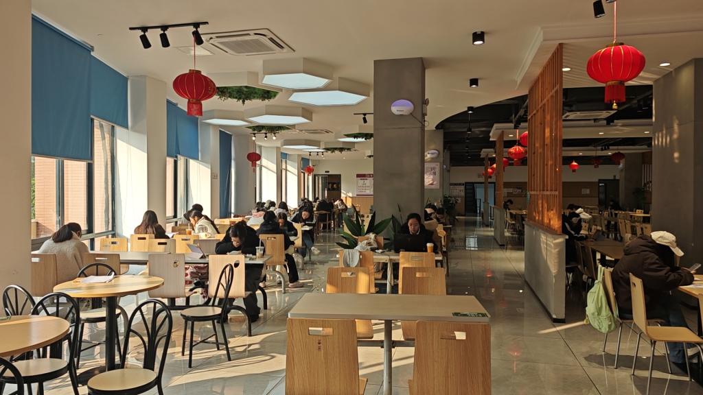 针对期末复习阶段学生的实际需求,食堂特别推出“暖冬伴学”计划,持续至考试季结束。一是开辟“静学专区”,在各食堂设置复习区,配备空调、充足电源与照明。二是提供免费服务,各楼层免费供应开水;购买指定热饮可享免费续杯。三是延长便利服务,午间晚间延长供餐时间,并供应平价暖心饮品或小食,复习区旁提供物品临时寄存等便利。