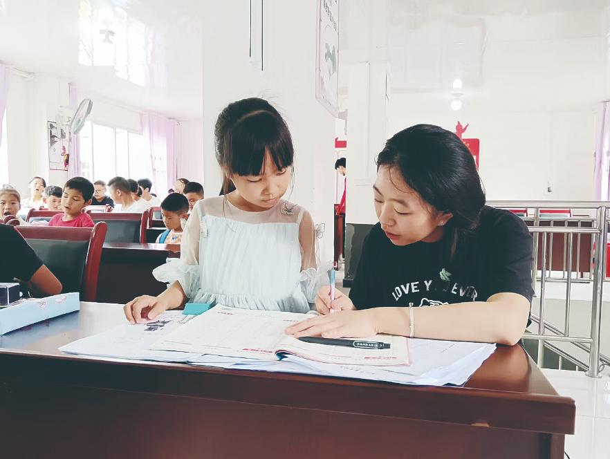 ▲杨轹文辅导小朋友学习