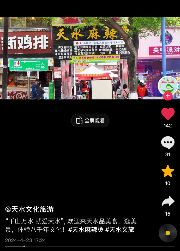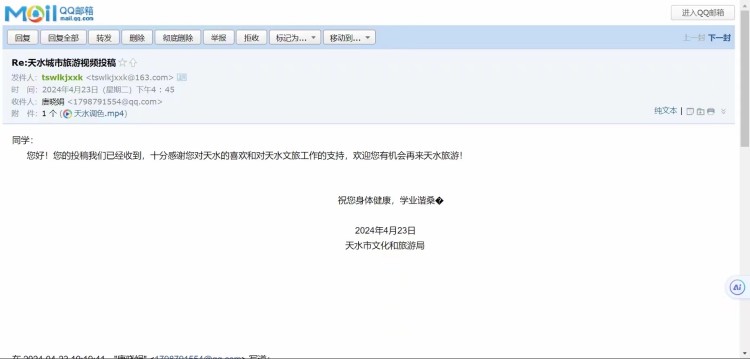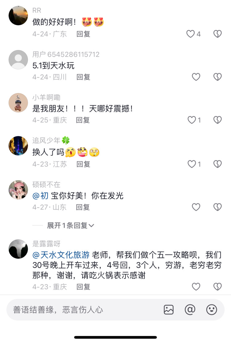 回到重庆后,她把自己在天水旅行的经历剪辑成了一条视频,还顺手投给了天水文旅局官方账号,结果竟真的收到了对方回复,该视频也被天水文旅局官号发布在了短视频平台上!