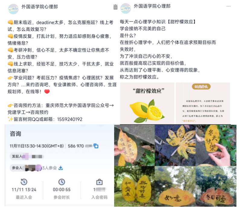 外国语学院定期整理同学心理发展共性问题,借外国语学院心理部QQ平台,定期普及精神卫生及心理健康知识并编辑推文宣传学院咨询特色活动,不断提高学生心理健康水平,帮助同学以饱满状态热情投入学业与生活。