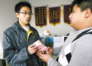 昨日“砍柴男孩”李露(左)将10000元奖金交给绿叶义工组织。