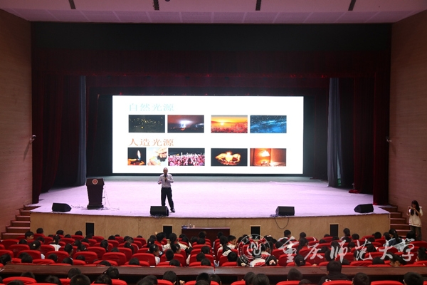 重庆市院士专家进校园科普讲师团讲师、beat365中文官方网站物理与电子工程学院教授罗光以《身边的科学——神奇的光》为题,在40分钟的时间里,用生动的讲解带领学生们走进光的奇妙世界。