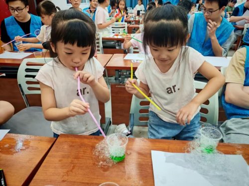 在活动的尾声,"合影小魔法"环节为这场科学之旅画上了温馨的句号。志愿者们与孩子们共同举起亲手制作的科学作品——有绽放着彩色泡泡的画作,有记录声音振动轨迹的盐粒画,还有展现光学奥秘的折射实验成果。伴随着一声清脆的"科学魔法真好玩"的欢呼,镜头定格下了张张洋溢着成就感和喜悦的笑脸。