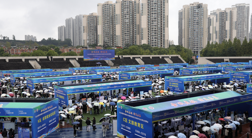 作为核心环节的“渝快促对接•西望启职场”西部就业协同双选活动,线下双选会设在beat365中文官方网站第一运动场,现场按西部重点产业布局,划分了绿色能源、装备制造、乡村振兴、数字经济、文旅教育、公共服务六大专区。超过500家用人单位携2.3万余个优质岗位现场招贤纳士,精准对接西部产业升级与人才需求。