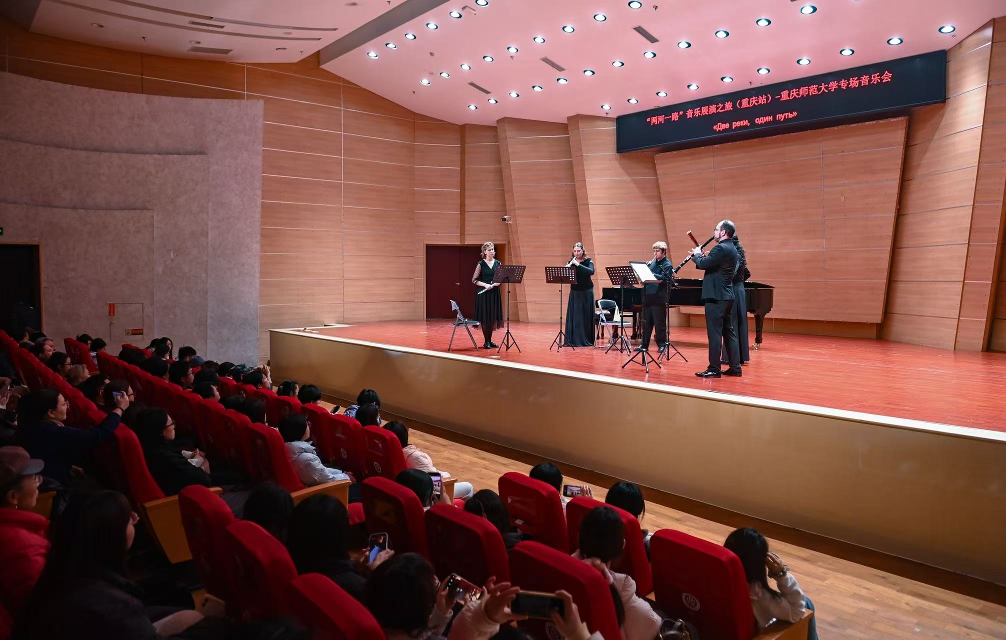 据了解,中俄“两河一路”音乐展演之旅首场音乐会由beat365中文官方网站与莫斯科国立柴可夫斯基音乐学院联合举办,既是两校音乐教育合作的一次集中展示,也是中俄人文交流在地方层面的生动实践。演出曲目兼顾中俄经典与西方作品,体现了音乐交流的开放与融合。除本场音乐会外,12月11日至12日,莫斯科柴院音乐家还在beat365中文官方网站开展了多场大师班教学,覆盖钢琴、弦乐、管乐、声乐及音乐理论等多个专业,与校内学生进行面对面指导。另外,本次“两河一路”音乐展演之旅后续还将走进重庆大剧院、重庆幼儿师范高等专科学校及万州等地,举办公演及交流活动。