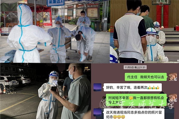 梁人义主动投身属地南岸区铜元局街道梨支园社区疫情防控,多次担任志愿登记员、采样员、搬运工,他时刻用朝气蓬勃的热情感染着周围的同事,同志愿者们一起把青春力量拧成一股绳,为辖区居民筑牢抗疫屏障。地理与旅游学院中共预备党员姚雨婷同学主动参与属地兰州疾控中心组织的培训,协助当地的核酸检测工作;“战衣”上身,一穿就是9小时,她用自己实际行动践行入党初心,努力做到“关键时刻站得出来、危急关头豁得出去”的优良作风。文学院党员黄巧丽同学在实习学校——重庆市育才中学校化身“大白”,同医护人员一起奋战在疫情阻击战的第一线。