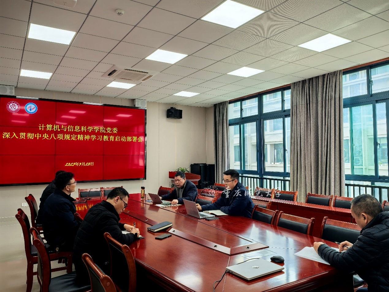 3月20日上午,计算机与信息科学学院党委在致用楼 302 会议室召开深入贯彻中央八项规定精神学习教育启动部署会。会议由学院党委书记王军主持。