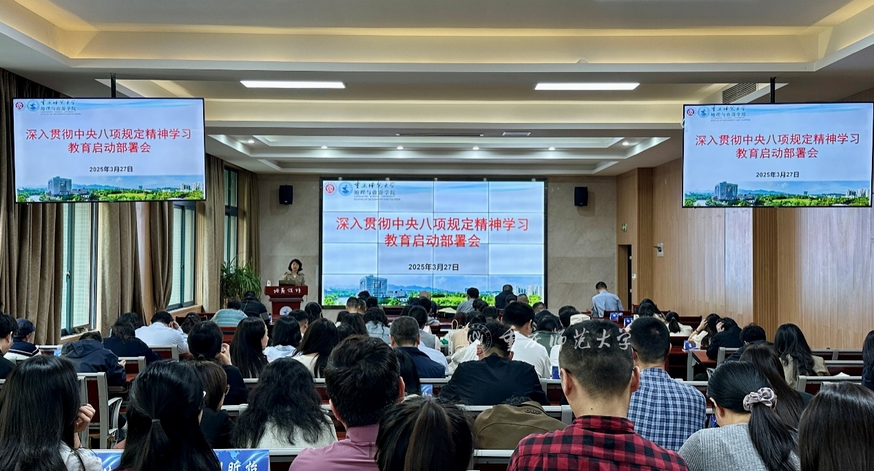 按照中共beat365中文官方网站委员会《关于在全校开展深入贯彻中央八项规定精神学习教育的实施方案》的通知(重师委发〔2025〕13号)要求,3月27日,学院召开了深入贯彻中央八项规定精神学习教育启动部署会),党委书记胡芳主持会议,学院全体党员和教职员工参加会议,启动部署深入贯彻中央八项规定精神学习教育工作。