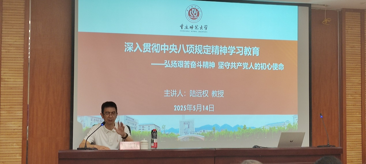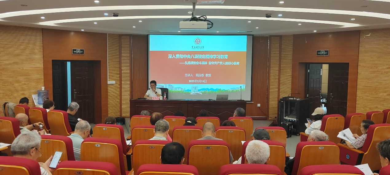 为进一步推动深入贯彻中央八项规定精神学习教育走深走实,帮助广大离退休党员更全面、深入理解中央八项规定精神内涵,5月14日上午,学校离退休党委在沙坪坝校区5201教室组织离退休各支部支委集体学习。学校副校级干部陆远权教授参加学习,并以“弘扬艰苦奋斗精神坚守共产党人的初心使命”为题,为大家讲授专题党课。离退休处党委书记刘艳主持会议。